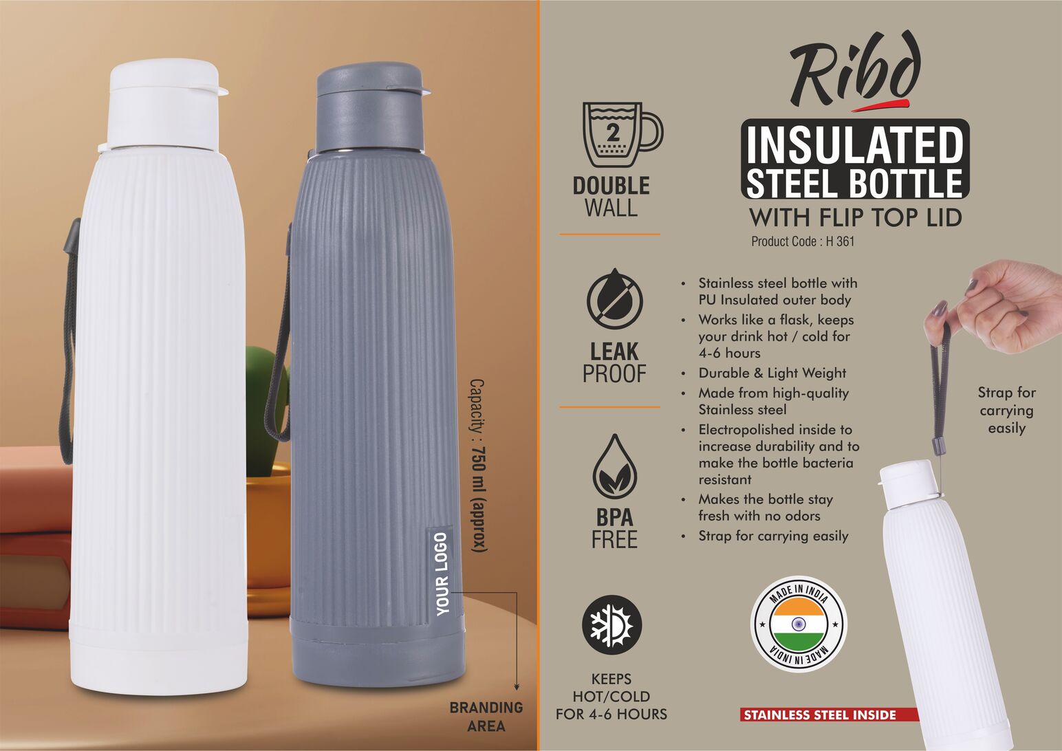 Ribd : Insulated Steel Bottle with flip top lid | Keeps Hot & Cold for 4-6 Hours | Strap for Carrying easily | Capacity 750 ml approx
